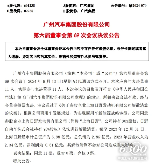 9月14日,廣州汽車集團(tuán)股份有限公司發(fā)布第六屆董事會第69次會議決議公告。公告顯示,為實現(xiàn)商用車新能源戰(zhàn)略轉(zhuǎn)型,廣汽集團(tuán)同意參股企業(yè)上海日野發(fā)動機(jī)有限公司(簡稱“上海日野”,廣汽集團(tuán)持有30%股權(quán),日野自動車株式會社持有70%股權(quán))依法進(jìn)行解散清算;截至2023年12月31日,上海日野經(jīng)審計總資產(chǎn)為6.98億元,總負(fù)債為2.86億元,2023年營業(yè)收入為2.34億元,凈利潤為-0.61億元;其解散清算不會對公司造成重大影響。與此同時,上海日野發(fā)動機(jī)有限公司官網(wǎng)發(fā)布了一則告知書。告知書顯示:受市場整體環(huán)境的影響,公司慎重考慮,決定2024年9月30日停止生產(chǎn)。生產(chǎn)停止后,備件和售后服務(wù)將由日野在中國的售后服務(wù)網(wǎng)絡(luò)提供,服務(wù)電話不變4008208551。
