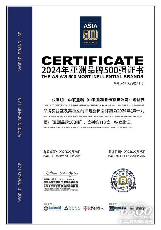 中聯(lián)重科《2024年亞洲品牌500強》證書