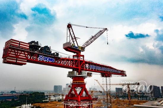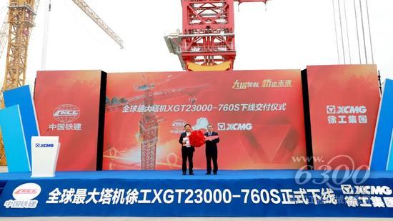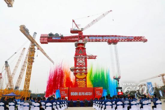 儀式現(xiàn)場(chǎng),全球最大塔機(jī)XGT23000-760S順利完成1.25倍動(dòng)載起吊,吊裝重量達(dá)到950噸