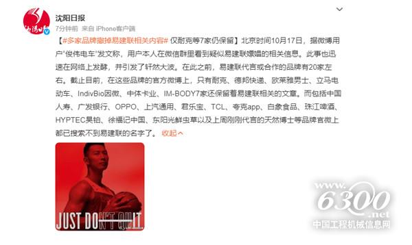 截止目前,在這些品牌的官方微博上,只有耐克、德邦快遞、歐萊雅男士、立馬電動(dòng)車(chē)、IndivBio因微、中體卡業(yè)、IM-BODY7家還保留著易建聯(lián)相關(guān)的文章。而包括中國(guó)人壽、廣發(fā)銀行、OPPO、上汽通用、君樂(lè)寶、TCL、夸克app、白象食品、珠江啤酒、HYPTEC昊鉑、徐福記中國(guó)、東陽(yáng)光鮮蟲(chóng)草以及上周剛剛代言的天然博士等品牌官微上都已搜索不到易建聯(lián)的名字了。