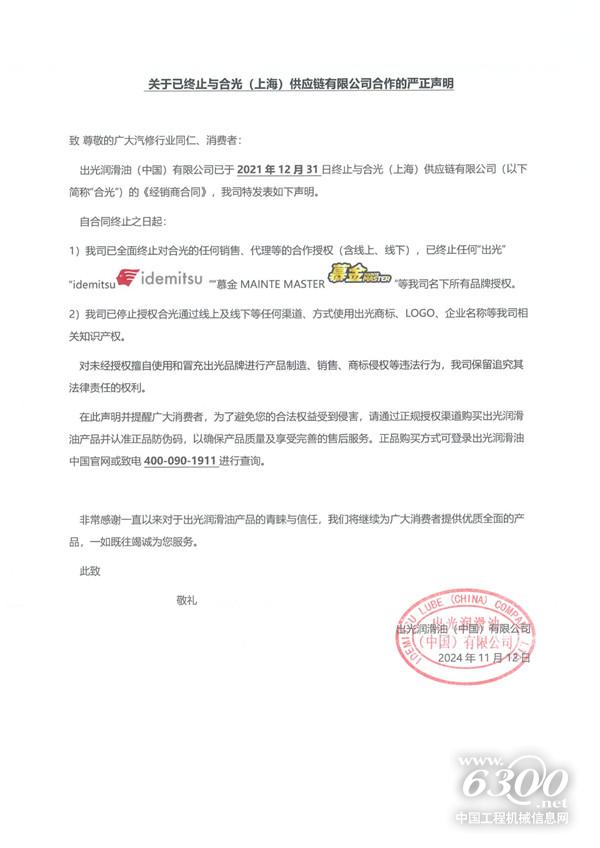 出光潤滑油(中國)有限公司已于2021年12月31日終止與合光(上海)供應(yīng)鏈有限公司(以下簡稱“合光”)的《經(jīng)銷商合同》,我司特發(fā)表如下聲明。