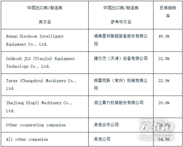 ▲ 歐盟對(duì)華移動(dòng)式升降作業(yè)平臺(tái)反傾銷(xiāo)終裁征稅表