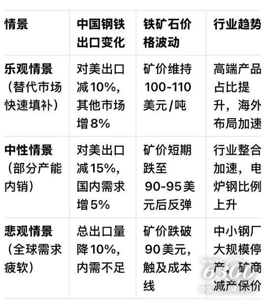 1. 短期需求波動 - 鋼廠減產(chǎn)預(yù)期:若出口受阻導(dǎo)致國內(nèi)鋼價下跌,部分鋼廠可能主動減產(chǎn),短期內(nèi)壓制鐵礦石需求。 - 庫存周期調(diào)整:鋼廠或推遲鐵礦石補(bǔ)庫,壓低港口現(xiàn)貨價格(如青島港62% Fe現(xiàn)貨價可能短期跌至90-95美元/噸)。 2. 長期結(jié)構(gòu)性變化 - 區(qū)域產(chǎn)能轉(zhuǎn)移:中國鋼廠可能加大對東南亞、非洲的海外基地投資(如青山印尼園區(qū)、河鋼塞鋼),帶動當(dāng)?shù)罔F礦石需求,間接支撐全球礦價。 - 廢鋼替代效應(yīng):國內(nèi)電爐煉鋼比例可能提升,降低對鐵礦石依賴(2023年中國電爐鋼占比約10%,若提升至15%,年減鐵礦石需求約5000萬噸)。