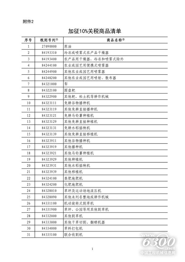 二、對原油、農(nóng)業(yè)機械、大排量汽車、皮卡加征10%關稅,具體商品范圍見附件2。