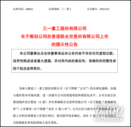三一重工股份有限公司(三一重工)發(fā)布公告稱,為深入推進全球化戰(zhàn)略,加強與境外資本市場對接,進一步提升公司治理透明度和規(guī)范化水平,公司目前正在籌劃境外發(fā)行股份(H股)并在香港聯(lián)合交易所有限公司上市事項。據(jù)悉三一預(yù)計集資最多15億美元(約116.7億港元)。