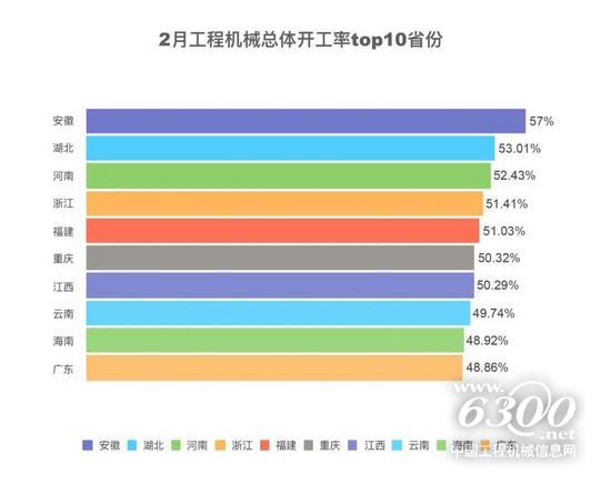 2月份,全國工程機(jī)械開工率為35.10%,安徽、湖北、河南、浙江、福建、重慶、江西開工率超50%。2月雖然處于春節(jié)假期,前10省份仍有近半數(shù)設(shè)備加班加點(diǎn),基礎(chǔ)建設(shè)呈現(xiàn)一片繁榮的景象。