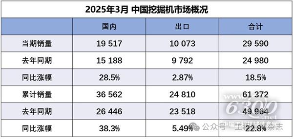 據(jù)中國工程機械工業(yè)協(xié)會對挖掘機主要制造企業(yè)統(tǒng)計,2025年3月銷售各類挖掘機29590臺,同比增長18.5%。其中國內(nèi)銷量19517臺,同比增長28.5%;出口量10073臺,同比增長2.87%。