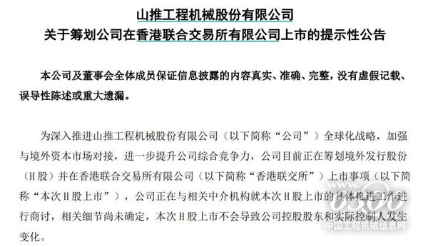 5月28日盤后,山推工程機(jī)械股份有限公司發(fā)布公告稱,為深入推進(jìn)公司全球化戰(zhàn)略,進(jìn)一步提升公司綜合競爭力,公司目前正在籌劃發(fā)行H股并在香港聯(lián)合交易所有限公司(以下簡稱“香港聯(lián)交所”)上市事項(以下簡稱“本次H股上市”),公司正在與相關(guān)中介機(jī)構(gòu)就本次H股上市的具體推進(jìn)工作進(jìn)行商討,相關(guān)細(xì)節(jié)尚未確定,本次H股上市不會導(dǎo)致公司控股股東和實際控制人發(fā)生變化。