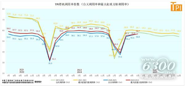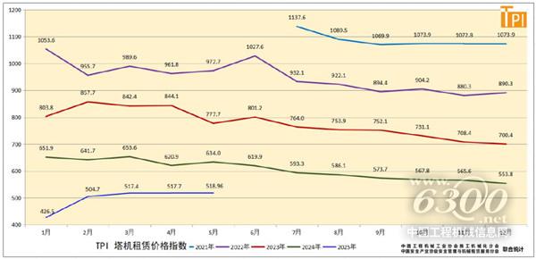 據(jù)中國(guó)工程機(jī)械工業(yè)協(xié)會(huì)施工機(jī)械化分會(huì)等統(tǒng)計(jì)的塔機(jī)租賃行業(yè)景氣指數(shù)(TPI),2025年5月份塔機(jī)臺(tái)天利用率56.8%,最大起重力矩利用率56.7%(系近3年最大起重力矩利用率首次低于臺(tái)天利用率),分別較上月高1.2個(gè)百分點(diǎn)和0.8個(gè)百分點(diǎn);5月份租賃價(jià)格指數(shù)為518.96點(diǎn),較上月高1.26點(diǎn),但低于去年同期115點(diǎn)。