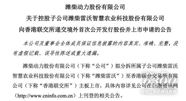 2.濰柴動力發(fā)布公告,其子公司濰柴雷沃?jǐn)M赴港上市;