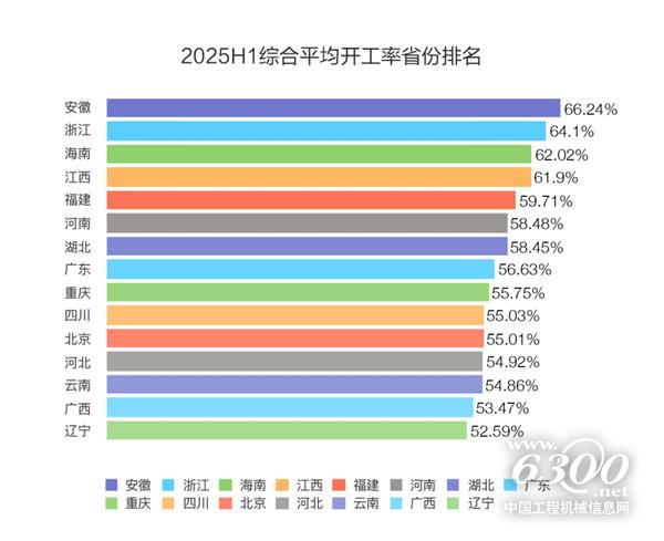2025年上半年,全國基建項(xiàng)目平穩(wěn)推進(jìn),全國工程機(jī)械平均開工率為44.81%。其中,第二季度開工率為47.1%,環(huán)比一季度上漲4.62%。15個(gè)省份平均開工率超過50%。