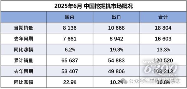 據(jù)中國工程機(jī)械工業(yè)協(xié)會(huì)統(tǒng)計(jì),2025年6月銷售各類挖掘機(jī)18804臺(tái),同比增長13.3%。其中國內(nèi)銷量8136臺(tái),同比增長6.2%;出口量10668臺(tái),同比增長19.3%。