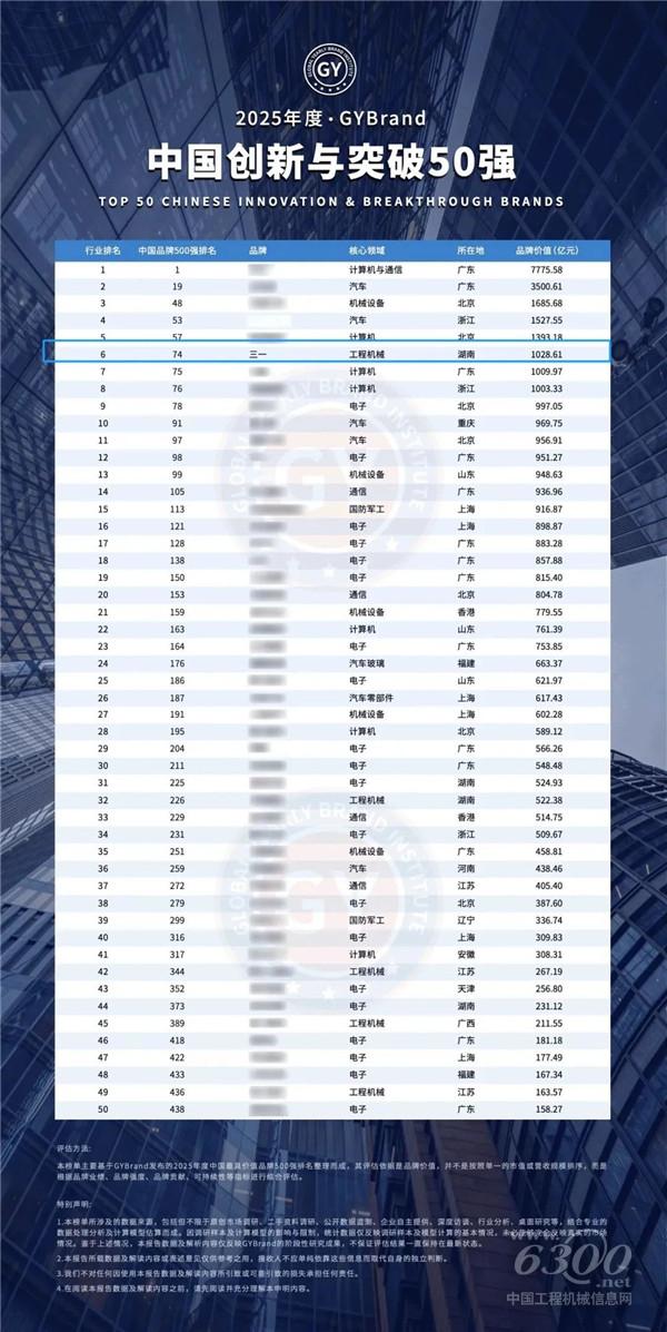 7月15日,GYBrand全球品牌研究院發(fā)布了2025年度“中國創(chuàng)新與突破50強”榜單。三一以1028.6億元的品牌價值躋身第六位,同時成為榜單中工程機(jī)械行業(yè)排名最高的企業(yè)。