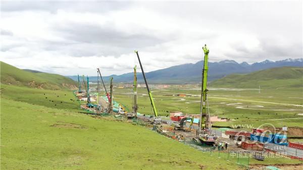 ▲中聯(lián)重科旋挖鉆機(jī)群、起重機(jī)等設(shè)備在川西高原助建理塘縣格者村特大橋