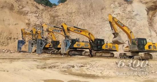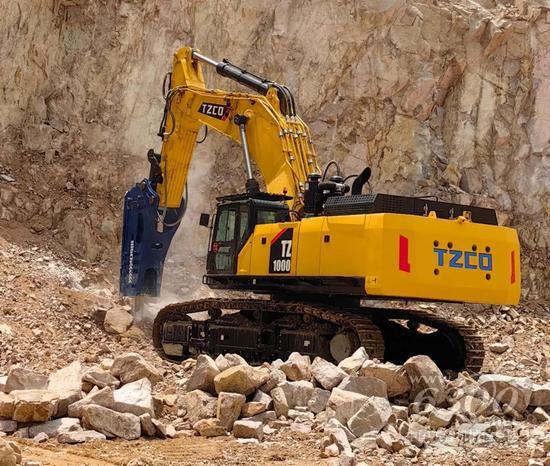 該礦區(qū)資源儲量豐富,但巖石硬度較高,配備破碎錘的太重超大型液壓挖掘機TZ1000,以高效率和高穩(wěn)定性被用戶堅定地選擇,在礦區(qū)施工作業(yè)中沖鋒陷陣: