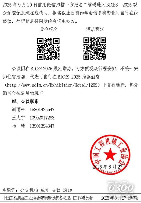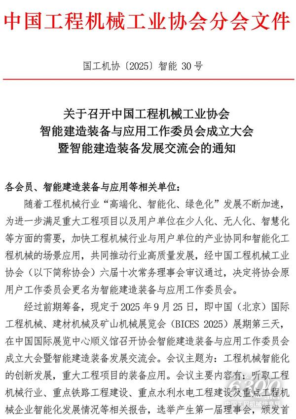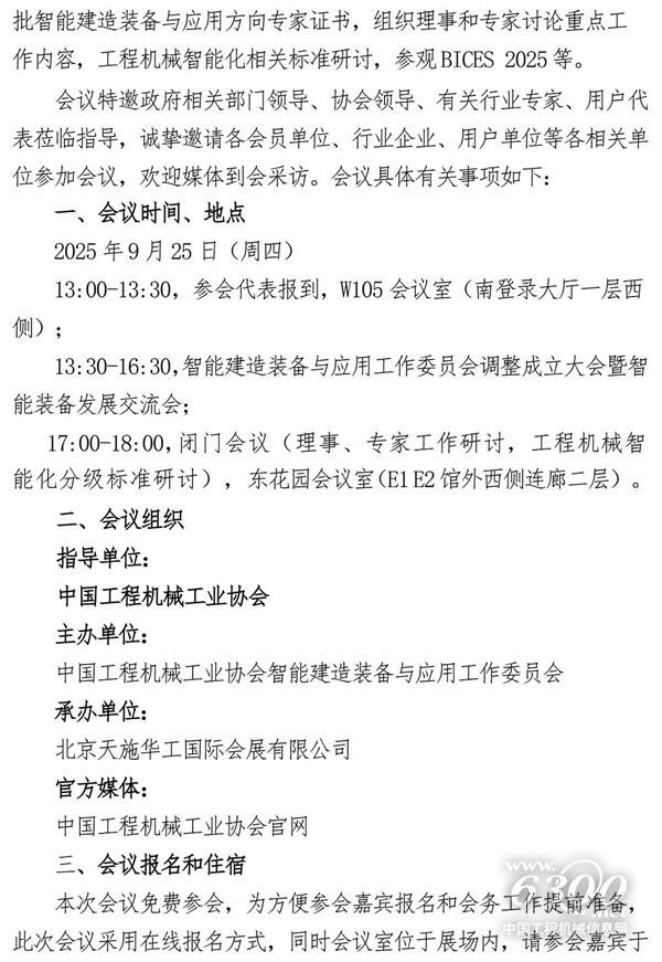 經(jīng)過(guò)前期籌備,現(xiàn)定于2025年9月25日,即中國(guó)(北京)國(guó)際工程機(jī)械、建材機(jī)械及礦山機(jī)械展覽會(huì)(BICES 2025)展期第三天,在中國(guó)國(guó)際展覽中心順義館召開(kāi)協(xié)會(huì)智能建造裝備與應(yīng)用工作委員會(huì)成立大會(huì)暨智能建造裝備發(fā)展交流會(huì)。會(huì)議主題為:工程機(jī)械智能化的創(chuàng)新發(fā)展,重大工程項(xiàng)目的裝備應(yīng)用。會(huì)議主要內(nèi)容有:聽(tīng)取工程機(jī)械行業(yè)、重點(diǎn)鐵路工程建設(shè)、重點(diǎn)水利水電工程建設(shè)及重點(diǎn)工程機(jī)械企業(yè)智能化發(fā)展情況等相關(guān)報(bào)告,選舉產(chǎn)生第一屆理事會(huì),頒發(fā)首批智能建造裝備與應(yīng)用方向?qū)<易C書(shū),組織理事和專(zhuān)家討論重點(diǎn)工作內(nèi)容,工程機(jī)械智能化相關(guān)標(biāo)準(zhǔn)研討,參觀BICES 2025等。