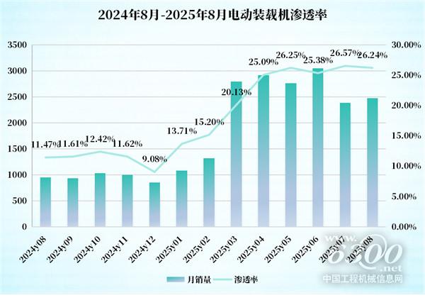 2025年以來(lái),電動(dòng)裝載機(jī)單月滲透率呈現(xiàn)穩(wěn)健攀升態(tài)勢(shì),從年初的13.71%一路躍升,4月突破25%大關(guān),7月更是創(chuàng)下26.57%的歷史新高,8月仍保持在26%以上高位,體現(xiàn)了電動(dòng)裝載機(jī)市場(chǎng)接受度指數(shù)級(jí)提升和供應(yīng)鏈的全面成熟。