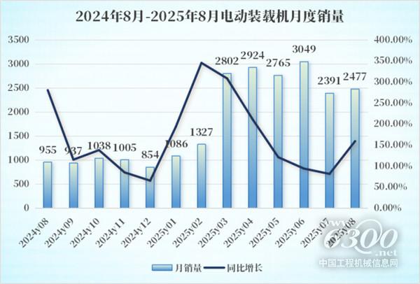 電動(dòng)裝載機(jī)保持高增長(zhǎng)態(tài)勢(shì),8月共銷售2477臺(tái),環(huán)比微升,同比激增159%。