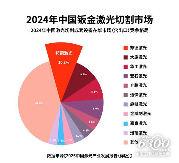 激光切割設(shè)備分為鈑金激光切割設(shè)備和精密激光切割設(shè)備。精密激光切割市場雖然剛剛起步,整體規(guī)模尚不及鈑金激光切割,但潛力巨大、成長空間顯著;而鈑金切割市場則呈現(xiàn)明顯兩極分化態(tài)勢。從整體競爭格局來看,前十強企業(yè)合計占據(jù)超過50%的市場份額。其中,邦德激光以10.3%的市占率再度蟬聯(lián)中國市場第一,連續(xù)兩年穩(wěn)居行業(yè)榜首。據(jù)記者調(diào)查,該企業(yè)堅持技術(shù)自研與產(chǎn)品創(chuàng)新,實現(xiàn)了激光器、激光頭、操作系統(tǒng)等關(guān)鍵部件的自主研發(fā),并推出多款集成超高功率、全自動與智能化功能的高端機型,贏得市場廣泛認可。