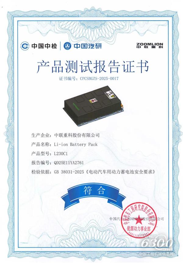 ▲中聯(lián)重科自主研發(fā)的系列化動(dòng)力電池通過新國標(biāo)認(rèn)證