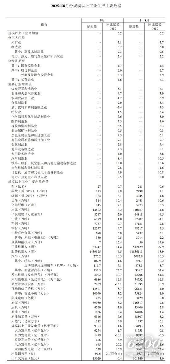 分三大門類看,8月份,采礦業(yè)增加值同比增長5.1%,制造業(yè)增長5.7%,電力、熱力、燃氣及水生產(chǎn)和供應業(yè)增長2.4%。