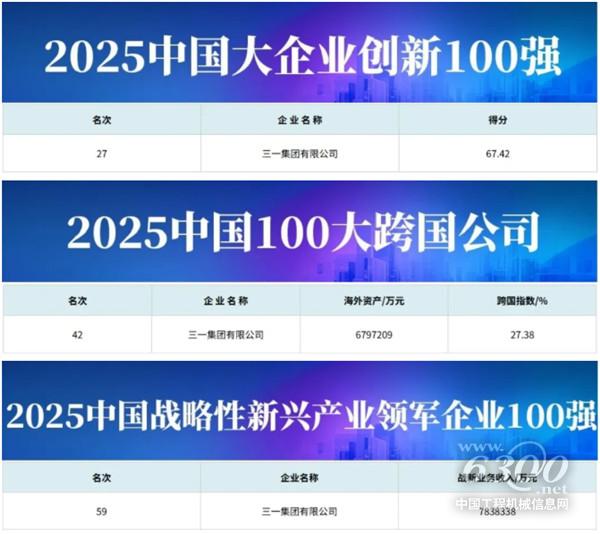 其中,三一在“中國(guó)大企業(yè)創(chuàng)新100強(qiáng)”和“中國(guó)跨國(guó)公司100大”中分列第27位和第42位,為行業(yè)最高排名。