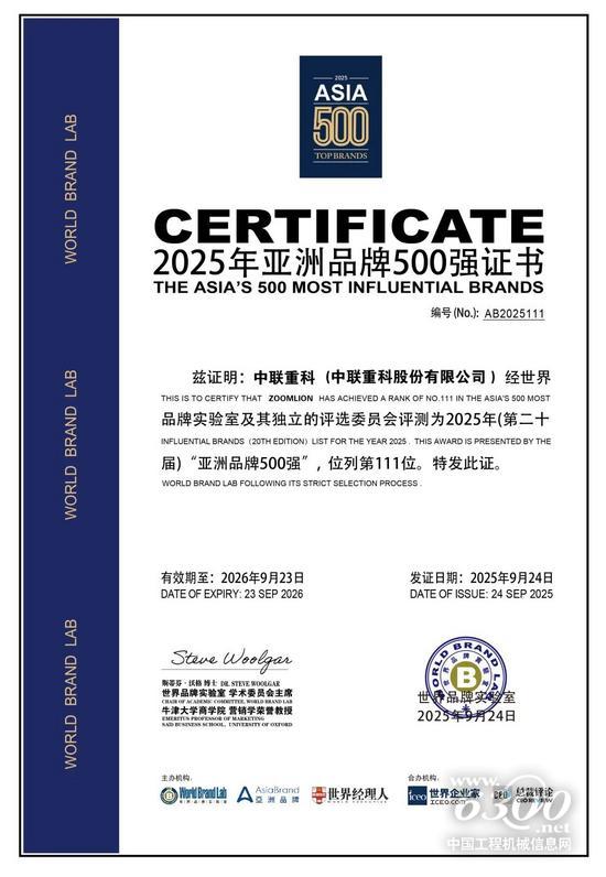 中聯(lián)重科《2025年亞洲品牌500強》證書