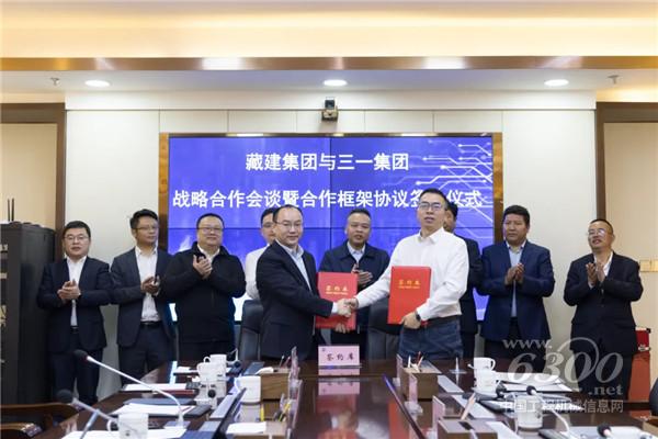 三一集團(tuán)副總裁、工程車輛事業(yè)部董事長(zhǎng)周國元,藏建集團(tuán)黨委委員、副總經(jīng)理兼法律顧問陳鵬分別代表雙方簽約。