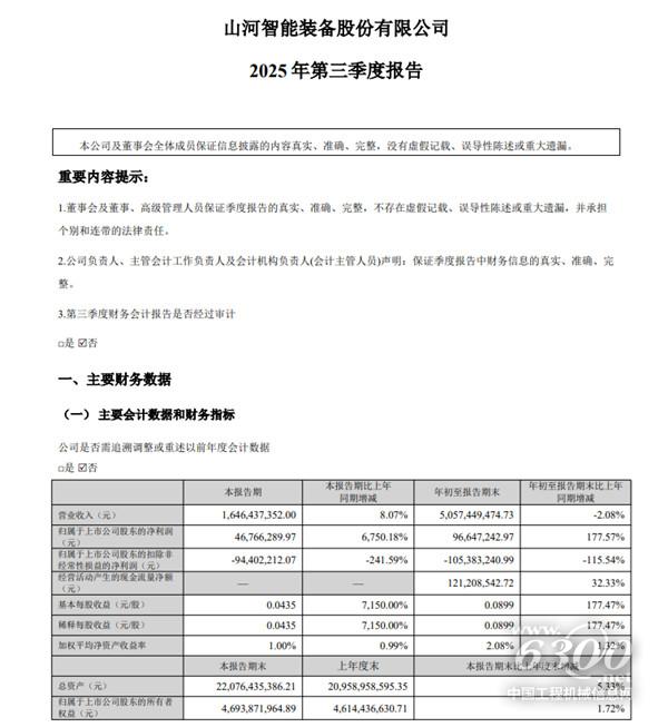 近日,山河智能發(fā)布2025年三季報(bào)顯示,公司前三季實(shí)現(xiàn)營(yíng)業(yè)收入50.57億元,同比下滑2.08%;歸母凈利潤(rùn)9664.72萬(wàn)元,同比增長(zhǎng)177.57%;扣非歸母凈利潤(rùn)-1.05億元。
