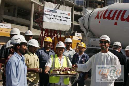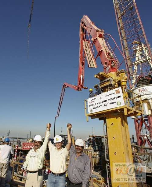 在2007年11月初,阿聯(lián)酋迪拜塔(Burj Dubai Tower)的普茨邁斯特(Putzmeister)超高壓混凝土泵達(dá)到了創(chuàng)記錄的泵送高度601米。比預(yù)想的還要早!在這個(gè)高度上,在全世界最壯觀的摩天大樓工程中,中央大廈核心的一面墻是在第155層澆灌混凝土的。泵送高度是從固定在建筑結(jié)構(gòu)中豎管的長(zhǎng)度和垂直輸送管道(包括管形柱和固定式布料桿)的長(zhǎng)度計(jì)算得出的。實(shí)際的混凝土澆注是在585米的高度進(jìn)行的。高層混凝土泵送還沒有結(jié)束,但已經(jīng)不遠(yuǎn)了。同時(shí),理想的泵送高度已經(jīng)上移到了611米,而目前混凝土泵工作得非常順利。