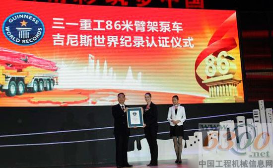 2011年12月11日,在海南博鰲舉行的“三一重工2011年度峰會(huì)”上,吉尼斯世界紀(jì)錄認(rèn)證機(jī)構(gòu)認(rèn)證官阿曼達(dá)•莫禪(Amanda Elizabeth Mochan)專(zhuān)程從美國(guó)前來(lái),將“世界最長(zhǎng)臂架泵車(chē)”的證書(shū)交到了三一重工執(zhí)行總裁易小剛手中。作為全球訪(fǎng)問(wèn)量最大、影響力最大的互聯(lián)網(wǎng)工程機(jī)械行業(yè)媒體,中國(guó)工程機(jī)械信息網(wǎng)(www.yuegoukeji.cn)與各大主流媒體以及1100多位三一重工客戶(hù)代表共同見(jiàn)證了這一偉大歷史時(shí)刻。