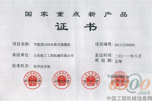 2011年,山東臨工申報(bào)的節(jié)能型LG953L輪式裝載機(jī)被國(guó)家科技部、環(huán)保部、商務(wù)部、質(zhì)量監(jiān)督檢驗(yàn)檢疫總局聯(lián)合評(píng)為“國(guó)家重點(diǎn)新產(chǎn)品”。
