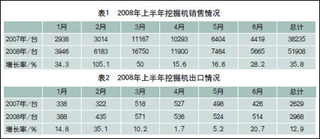 2008上半年挖掘機銷售及出口情況