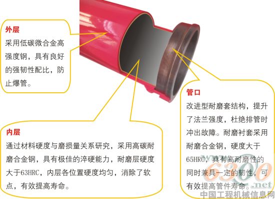 根據(jù)三一重工配件研制人員表示,不同于傳統(tǒng)的單層輸送管,五代管采用雙層結(jié)構(gòu)的新穎設計,內(nèi)層采用高碳合金耐磨鋼,外層采用高韌性的低碳微合金高強度鋼,通過特殊的緊密復合工藝成型,有效解決了單層管耐磨與防爆不能兼容的矛盾;同時,通過采用高速冷卻熱處理方式,使管件整體硬度高而均勻。經(jīng)測試,管道平均使用壽命達4萬方以上,相比普通泵車管,壽命提升幅度超過100%。而且與三代管相比,在結(jié)構(gòu)改進上,五代管管口采用新型法蘭及耐磨套結(jié)構(gòu),有效解決了排管時內(nèi)管沖出的問題。