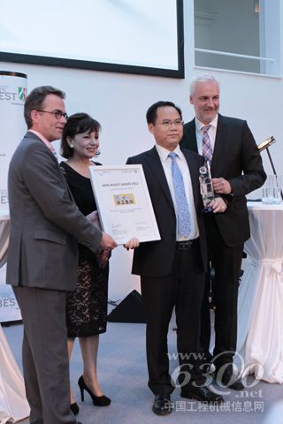 圖為杜因部長(右一)、華佩女士(左二)和卡特施戴德市長(左一)向徐工集團代表頒發(fā)最佳投資獎獎杯和證書