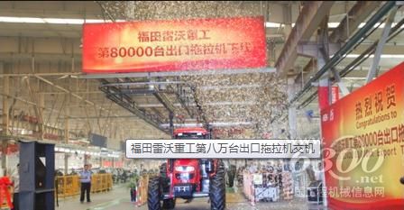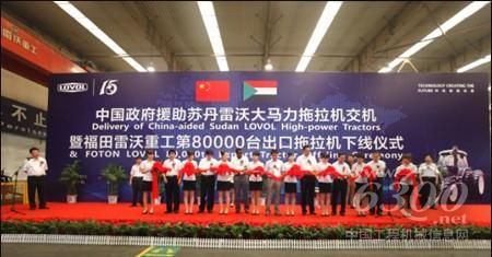 隨著300臺雷沃大馬力拖拉機作為中國政府援外項目的中國制造代表交機蘇丹,福田雷沃重工累計出口拖拉機突破8萬臺。2013年7月31日,福田雷沃重工第8萬臺出口拖拉機下線暨中國政府援助蘇丹雷沃大馬力拖拉機交機儀式,在福田雷沃重工大馬力拖拉機生產(chǎn)車間內(nèi)隆重舉行。