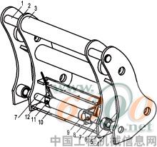 連接活塞桿和連接銷的鎖緊組合11上設(shè)有指示桿12,當(dāng)活塞桿伸出或縮進(jìn)時(shí),指示桿12可隨之相應(yīng)進(jìn)行擺動(dòng),駕駛員在座椅上通過(guò)觀察指示桿12(漆有醒目顏色)在液壓缸伸長(zhǎng)和收縮全過(guò)程的位置狀況,可方便地獲得快換裝置與屬具之間的銜接狀況,避免因誤操作而導(dǎo)致連接銷伸出不到位、屬具意外松脫等現(xiàn)象,保證了拆裝安全。