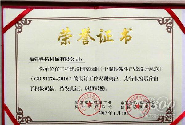 福建鐵拓機械有限公司因在標準制訂工作中表現(xiàn)突出,為行業(yè)發(fā)展中作出了積極貢獻,受到中國建筑材料聯(lián)合會預(yù)拌砂漿分會和國家建筑材料工業(yè)標準定額總站的表彰,并授予“特別貢獻單位”稱號。