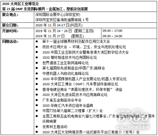 由訊通展覽公司舉辦之2020大灣區(qū)工業(yè)博覽會、第二十三屆DMP國際模具、金屬加工、塑膠及包裝展,將于2020年11月24-27日在深圳國際會展中心(深圳寶安)舉行!此大型工業(yè)界盛事匯聚世界各地知名機(jī)械制造商,絕對不容錯過!