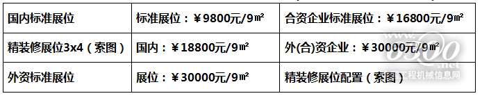1、標(biāo)準(zhǔn)展位9m2(3m×3m);配置:展出場(chǎng)地、三面展板(高2.5m)、一塊中英文楣板 、一 張洽談桌、二把椅子、地毯、220V電源插座一個(gè)、二支射燈。 (注:雙開口展位加收10%)