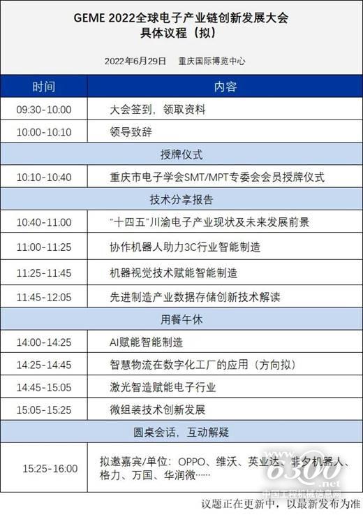 展會同期將舉辦GEME 2022全球電子產(chǎn)業(yè)鏈創(chuàng)新發(fā)展大會,針對"十四五"川渝電子產(chǎn)業(yè)現(xiàn)狀及未來發(fā)展前景、機(jī)器視覺技術(shù)賦能智能制造、協(xié)作機(jī)器人助力3C行業(yè)智能制造、先進(jìn)制造業(yè)數(shù)據(jù)存儲創(chuàng)新技術(shù)解讀、智慧物流在數(shù)字化工廠的應(yīng)用、激光智造賦能電子行業(yè)、微組裝技術(shù)創(chuàng)新發(fā)展”等熱點(diǎn)技術(shù)議題,進(jìn)行全面學(xué)術(shù)交流及技術(shù)探討。
