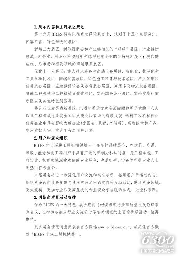 優(yōu)化十一大展區(qū):重大技術(shù)裝備和高端設(shè)備展區(qū),智能化、數(shù)字化和工業(yè)互聯(lián)網(wǎng)展區(qū),高端配套展區(qū),綠色施工裝備與技術(shù)展區(qū),產(chǎn)業(yè)聚集區(qū)優(yōu)勢(shì)裝備展區(qū),應(yīng)急救援設(shè)備及冰雪裝備展區(qū),商用車及物流裝備展區(qū),智能工程機(jī)械和工程機(jī)械文化體驗(yàn)區(qū),室外綜合企業(yè)展區(qū),室外挑戰(zhàn)和演示區(qū)以及其他特色展區(qū)等。