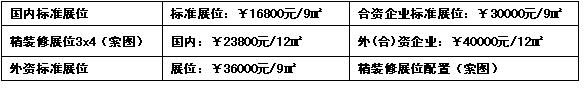 1、標準展位9m2(3m×3m);配置:展出場地、三面展板(高2.5m)、一塊中英文楣板 、一 張洽談桌、二把椅子、地毯、220V電源插座一個、二支射燈。 (注:雙開口展位加收20%)