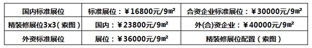 1、標(biāo)準(zhǔn)展位9m2(3m×3m);配置:展出場地、三面展板(高2.5m)、一塊中英文楣板 、一 張洽談桌、二把椅子、地毯、220V電源插座一個、二支射燈。 (注:雙開口展位加收20%)