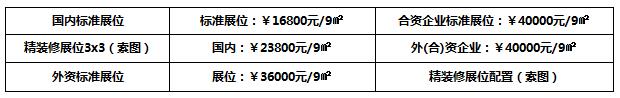 1、標(biāo)準(zhǔn)展位9m2(3m×3m);配置:展出場地、三面展板(高2.5m)、一塊中英文楣板 、一 張洽談桌、二把椅子、地毯、220V電源插座一個、二支射燈。 (注:雙開口展位加收20%)