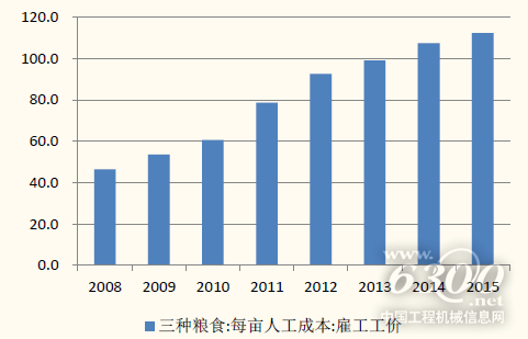農(nóng)村勞動(dòng)力結(jié)構(gòu)改變?cè)黾愚r(nóng)業(yè)機(jī)械化需求。隨著城鎮(zhèn)化的推進(jìn),我國農(nóng)業(yè)人口持續(xù)減少。2015年我國農(nóng)民工人數(shù)達(dá)到2.77億,占農(nóng)村總?cè)丝诘谋壤岣叩?6%。農(nóng)村人口轉(zhuǎn)移造成農(nóng)業(yè)勞動(dòng)力人口不足,農(nóng)村雇工工價(jià)持續(xù)增長(zhǎng),至2015年每畝雇工工價(jià)達(dá)到112.4元,相比2008年增長(zhǎng)142%。