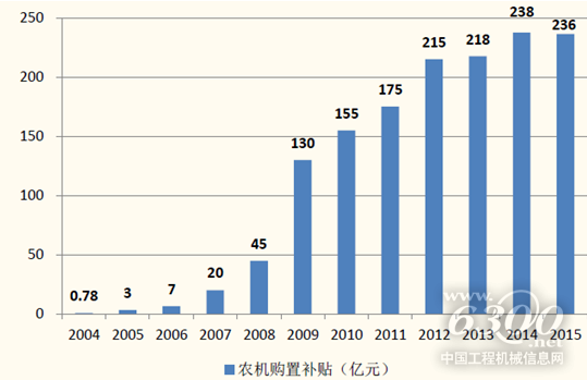 中央對(duì)農(nóng)機(jī)購置的財(cái)政補(bǔ)貼資金從2004年的0.78億元增加到2015年的236億元,增長(zhǎng)300多倍;補(bǔ)貼機(jī)型已擴(kuò)展到12大類175個(gè)品目,基本覆蓋農(nóng)林牧漁生產(chǎn)的主要機(jī)械設(shè)備,補(bǔ)貼范圍也已達(dá)到全國所有農(nóng)牧業(yè)縣。農(nóng)機(jī)補(bǔ)貼資金的增長(zhǎng),加速了國內(nèi)農(nóng)業(yè)機(jī)械化進(jìn)程和農(nóng)機(jī)裝備產(chǎn)業(yè)的發(fā)展。