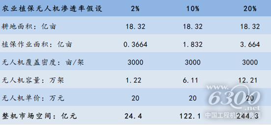 未來植保無人機(jī)整機(jī)銷售市場(chǎng)規(guī)模年均可達(dá)數(shù)十億元。根據(jù)第二次全國土地調(diào)查結(jié)果,國內(nèi)耕地面積約20.27億畝,實(shí)際有效耕作面積18.32億畝。我們假設(shè)未來植保無人機(jī)的覆蓋密度為3000畝/架,則當(dāng)無人機(jī)滲透率達(dá)到20%時(shí),對(duì)應(yīng)無人機(jī)整機(jī)需求約為12.21萬架,按照單價(jià)20萬元估算未來總體市場(chǎng)規(guī)模約244億元。假設(shè)到2020年達(dá)到20%滲透率的目標(biāo),則未來5年年均市場(chǎng)規(guī)模可達(dá)48.8億元。