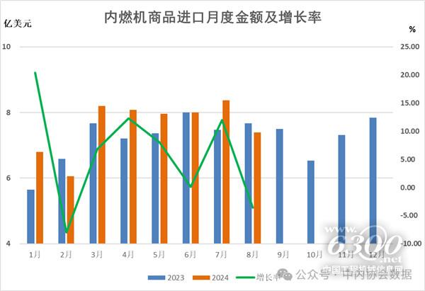 在進口金額中,2024年1-8月柴油機進口10.23億美元,同比增長26.38%;汽油機進口3.20億美元,同比增長6.88%;其他類整機進口14.42億美元,同比增長-18.89%;內(nèi)燃機零部件進口27.66億美元,同比增長10.99%;發(fā)電機組進口5.36億美元,同比增長40.48%。
