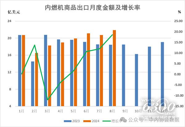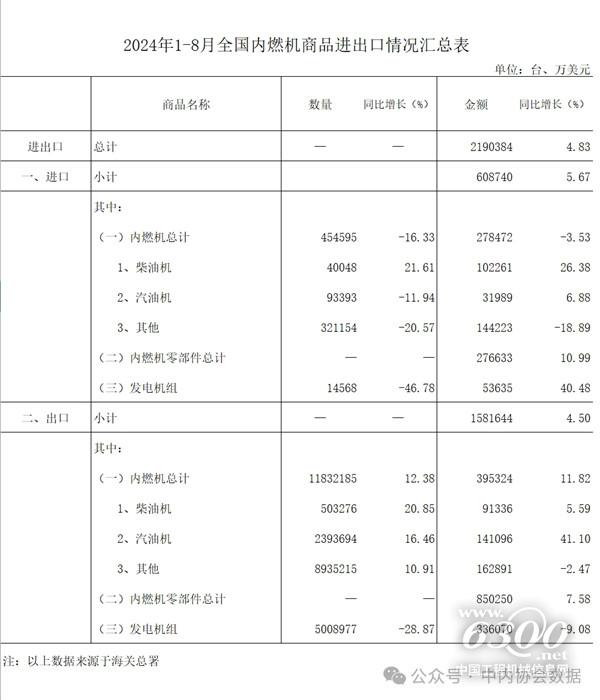 據(jù)海關(guān)總署數(shù)據(jù)整理,2024年1-8月內(nèi)燃機行業(yè)進出口總額219.04億美元,同比增長4.83%,其中,進口60.87億美元,同比增長5.67%,出口158.16億美元,同比增長4.50%。